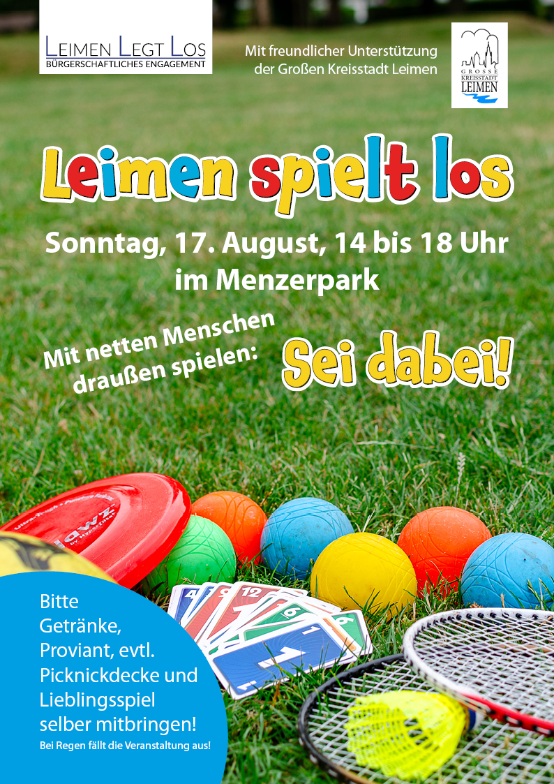 Wir setzen uns dafür ein, dass die Menschen gerne in Leimen und ihrer Nachbarschaft leben. Miteinander Spielen bringt Spaß und neue Kontakte. Gleichzeitig sollte der Spielenachmittag auch zeigen, was für eine schöne Freizeitmöglichkeite Leimen mit dem Menzerpark hat. Er kann jeden Tag genutzt werden und es bietet sich an, sich dort mit einer Decke unter einen der großen Bäume zu legen oder auch einfach mal die Wiese zum Spielen zu nutzen. Eine grüne Oase mitten in der Stadt!